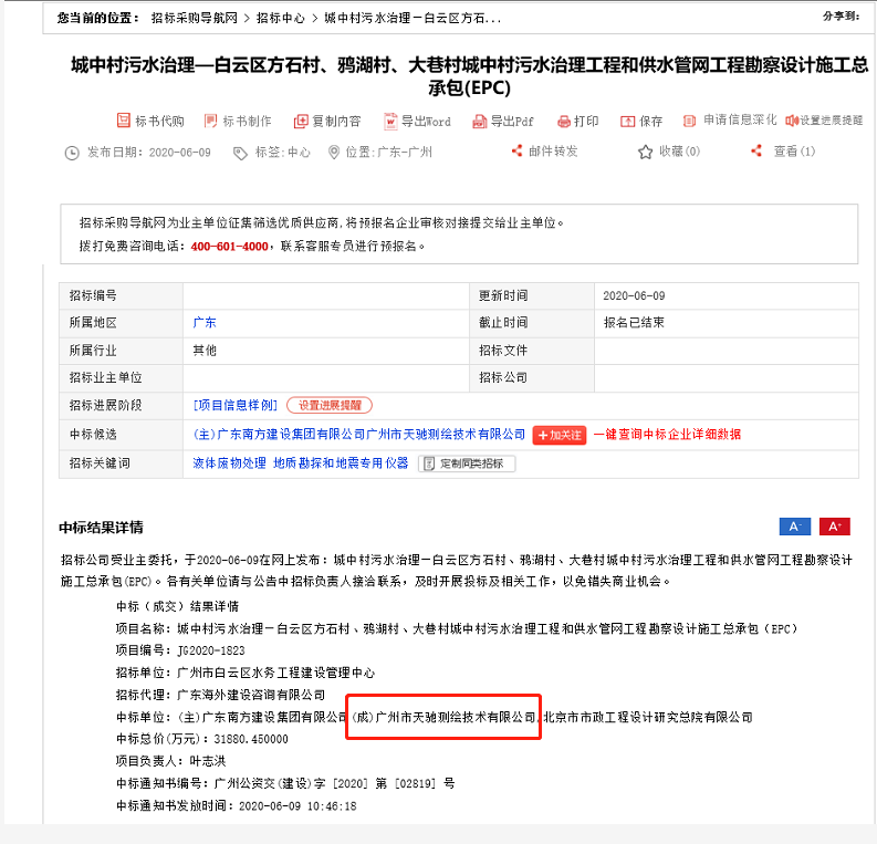 6月9日,天馳公司成功中(zhong)標“城(cheng)中(zhong)村(cun)污(wu)水(shui)治(zhi)理—白云(yun)區方石村(cun)、鴉湖村(cun)、大巷村(cun)城(cheng)中(zhong)村(cun)污(wu)水(shui)治(zhi)理工(gong)程和供(gong)水(shui)管網(wang)工(gong)程勘(kan)察設計施工(gong)總承包(EPC)”