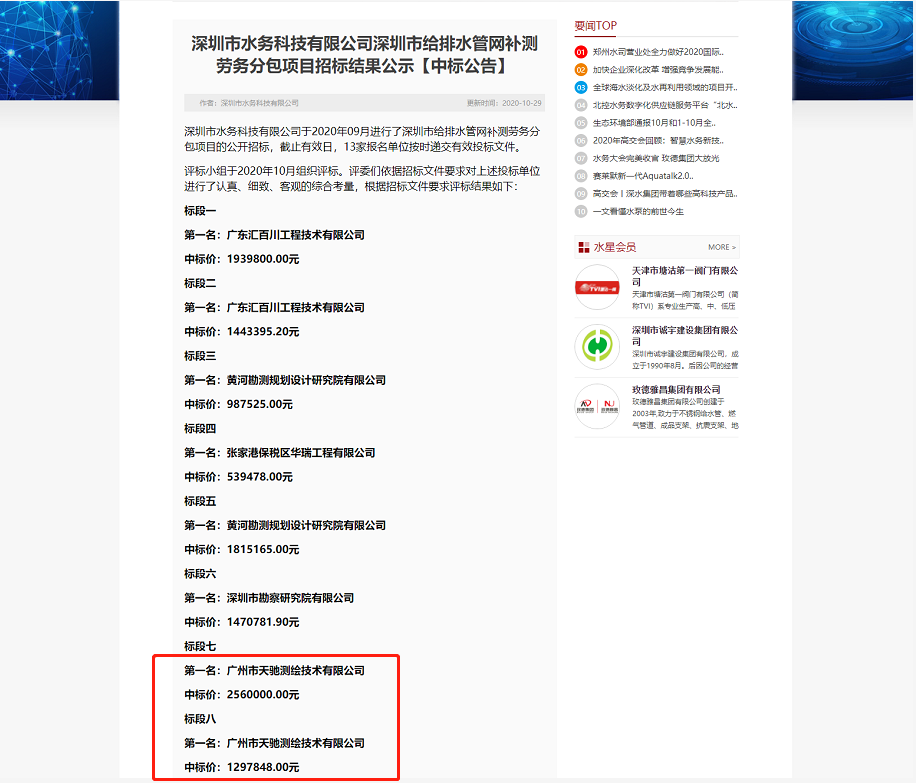 10月29日,天馳公(gong)司成功中標(biao)“深圳市(shi)水(shui)務科技有限公(gong)司深圳市(shi)給(gei)排水(shui)管(guan)網補測勞務分包(bao)項目”