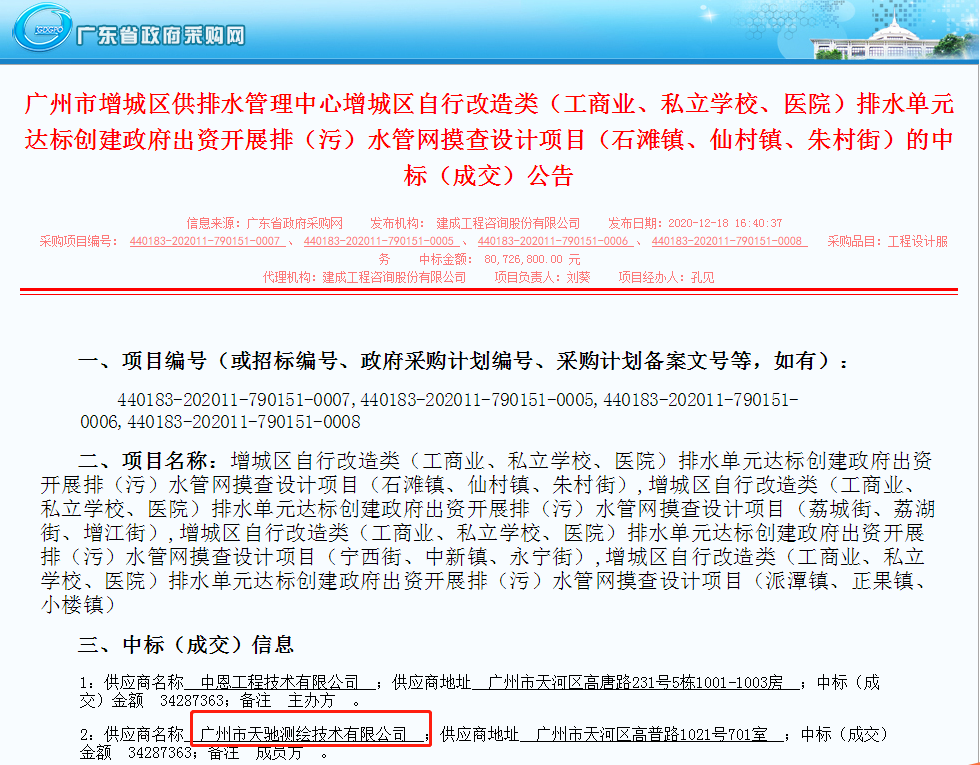 12月18日(ri),天馳公司成功中標“增城區(qu)自行(xing)改造類(工商業、私立學(xue)校(xiao)、醫(yi)院(yuan))排水單(dan)元達標創建(jian)政府出資開展(zhan)排(污)水管網摸(mo)查(cha)設計項(xiang)目(石灘鎮(zhen)、仙村鎮(zhen)、朱村街)”